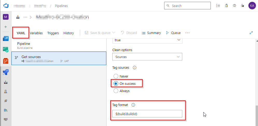 select YAML Tag sources –> Select On success